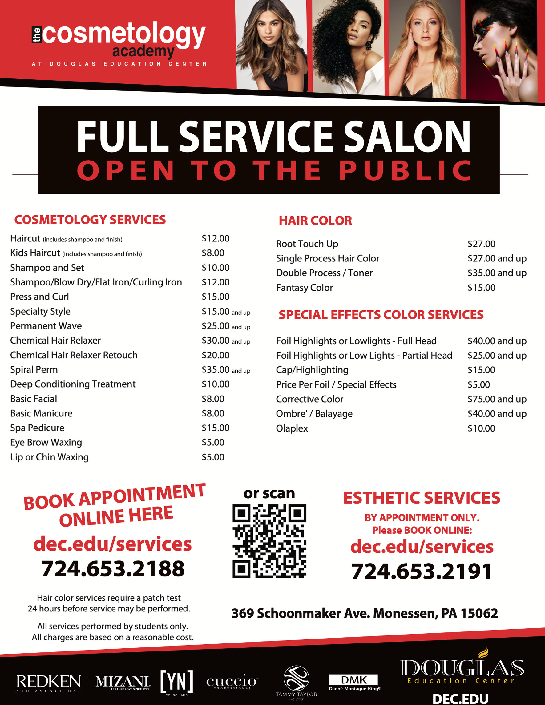 No chemical services will be started two hours prior to closing. Appointments recommended, but walk-ins welcome. All charges based on the reasonable cost of material only. All work done by students.